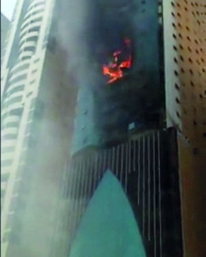 شب حريق في بناية قيد الإنشاء تتكون من 42 طابقاً في منطقة البحيرة في الشارقة، أمس، وأتت النيران على واجهة البناية على طول 11 طابقاً، من دون وقوع إصابات.