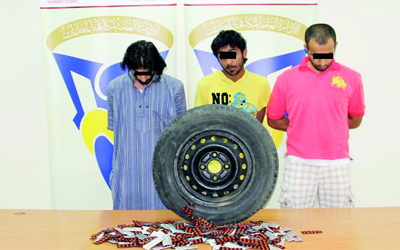 المتهمون وأمامهم الحبوب المخدرة والإطار الذي استخدموه لإخفائها. من المصدر