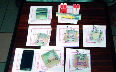 جانب من النقود والعقاقير المخدرة المضبوطة بحوزة الجناة. من المصدر