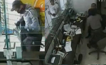 صورتان مركبتان من كاميرا الحراسة للموظفين خلال إخلاء المكتب وأحد اللصين وهو يحمل المال المسروق.