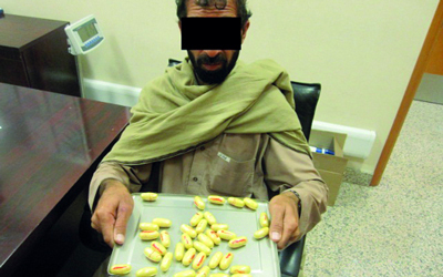 وذكر مدير إدارة عمليات المطارات في جمارك دبي، علي المقهوي، أن مفتشي الجمارك اشتبهوا في مسافر من دولة آسيوية لدى وصوله إلى صالة الجمارك، إذ لُوحظ على تحركاته مظاهر الارتباك والتردد، ونظراً لامتلاك مفتشي جمارك دبي خبرة ميدانية كبيرة في قراءة وتحليل لغة الجسد، بالإضافة إلى تلقيهم تدريبات مكثفة في فنون الاشتباه، تم وضع المسافر تحت المراقبة الدقيقة من قبل فرق مختص. ولدى وصوله إلى أجهزة التفتيش الأمامية تم تفتيش أمتعته التي لم يعثر بداخلها على شيء، فتم عرضه على جهاز كشف الأحشاء، الذي أثبت صحة اشتباه مفتشي الجمارك وفطنتهم، حيث تبين وجود أجسام غريبة في أحشائه.