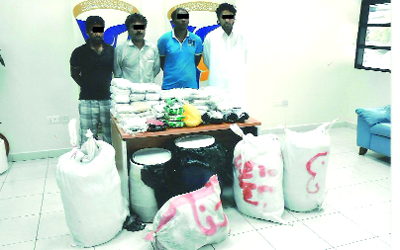 المتهمون الأربعة والمخدرات المضبوطة معهم. من المصدر