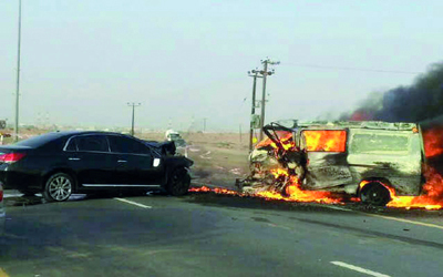 لقي ثلاثة أشخاص مصرعهم حرقاً، وتوفي سائق مواطن في حادث سير وقع مساء أول من أمس، على الطريق الفرعي المتجه من جسر رقم 6 على شارع الذيد إلى منطقة الرحمانية بين باص صغير محمل ببعض اسطوانات غاز أجهزة التكييف ولحام الاوكسجين ومركبة صالون يقودها مواطن، أسفر عنه وفاة سائق الباص وشخصين آخرين كانا برفقته واحتراق جثثهم بالكامل بسبب انفجار احدى اسطوانات الغاز، ووفاة سائق المركبة الصالون المتسببة في الحادث.