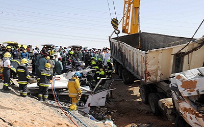 الحادث وقع عندما تدهورت شاحنة واستقرت فوق حافلة ركاب تقل عمالاً. من المصدر