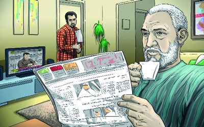 رسم تعبيري (غرافيك) يظهر تربّص الابن لضرب والده بساطور. من المصدر