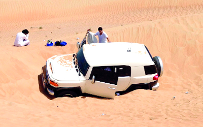 وكانت السيارة علقت في الصحراء في الساعة السادسة صباحاً، ولم يستطع المواطنون العالقون إخراجها، وحاولوا الاتصال بأصدقائهم، لكنهم لم يتمكنوا من تحديد موقعهم، فلجأوا إلى غرفة العمليات بعد شعورهم بالتعب الشديد، ونفاد المياه التي بحوزتهم.