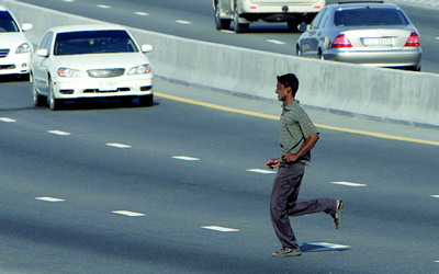 شخص يحاول قطع طريق سريع مزدحم بالمركبات. الإمارات اليوم