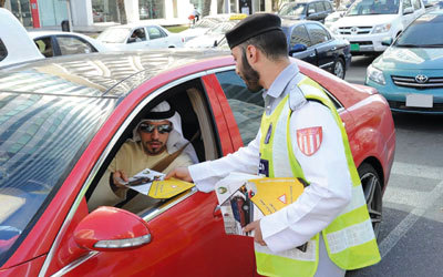 شرطي يوزع نشرات توعوية على أحد السائقين ارشيفية