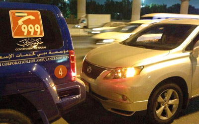 سيارة أسعاف أمام سيارة نوال في محاولة لخفض سرعتها بعد تعطل جهاز مثبت السرعة. الإمارات اليوم