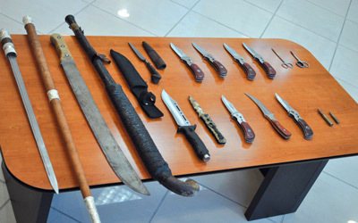 وأشار إلى ضبط أربعة سيوف مختلفة الأحجام، و10 خناجر، إضافة إلى رصاصتين، بحوزة المتهم.