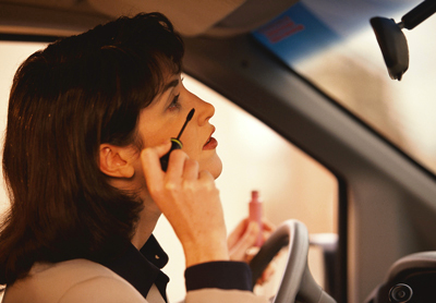 بعض النساء يستخدمن مرآة المظلة الأمامية بالمركبة لوضع الماكياج ما يحجب الرؤية عنهن. الإمارات اليوم