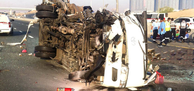وكان سائق حافلة العمال متجهاً إلى موقع العمل، وأثناء سيره اصطدم بشاحنة ثقيلة، كانت متوقفة على جانب الطريق، ما أدى إلى انقلاب الحافلة، ووقوع عدد من الوفيات والإصابات.