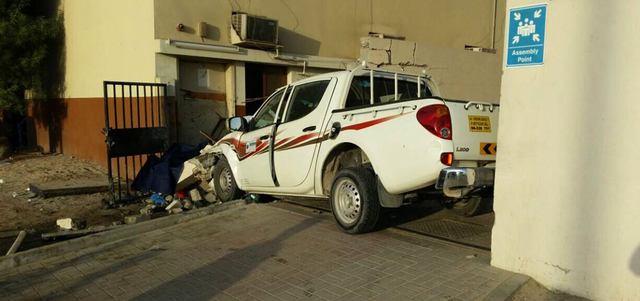 سيارة الـ «بيك آب» أدت إلى تدهور حافلة وصدمت مدخل شركة. من المصدر