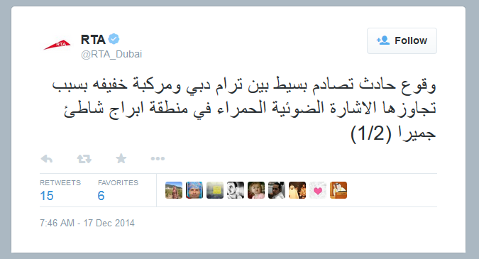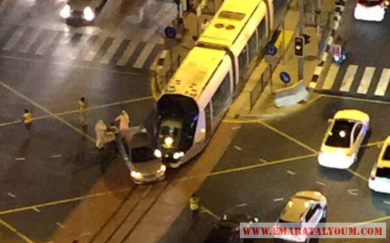 وقع حادث تصادم بسيط ما بين سيارة ركاب صغيرة قام سائقها بتجاوز الإشارة الحمراء، وترام دبي، في منطقة الجي بي آر، حسب ما نشرت هيئة الطرق والمواصلات بتغريدة خاصة في حسابها على موقع التواصل الاجتماعي "تويتر".