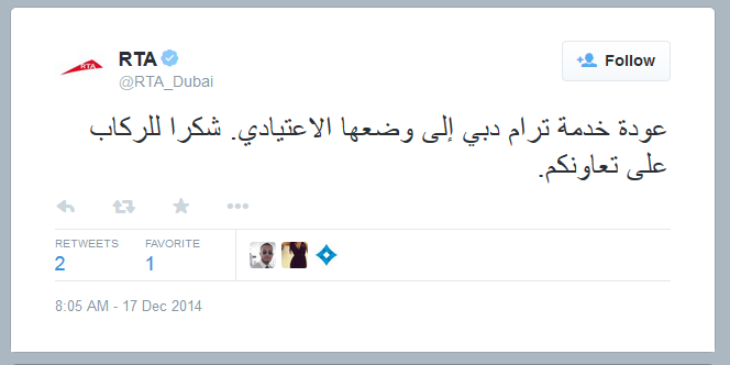 وأتبعت الهيئة تغريدتها الأولى بتغريدة ثانية عن انتهاء الحادث، وعودة خدمة الترام إلى وضعها الاعتيادي، متوجهة بالشكر للركاب على حسن تعاونهم.