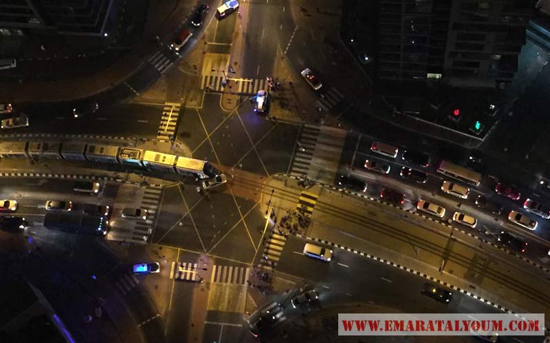 بالصور.. حادث تصادم بين سيارة وترام دبي في الـ"جي بي آر"