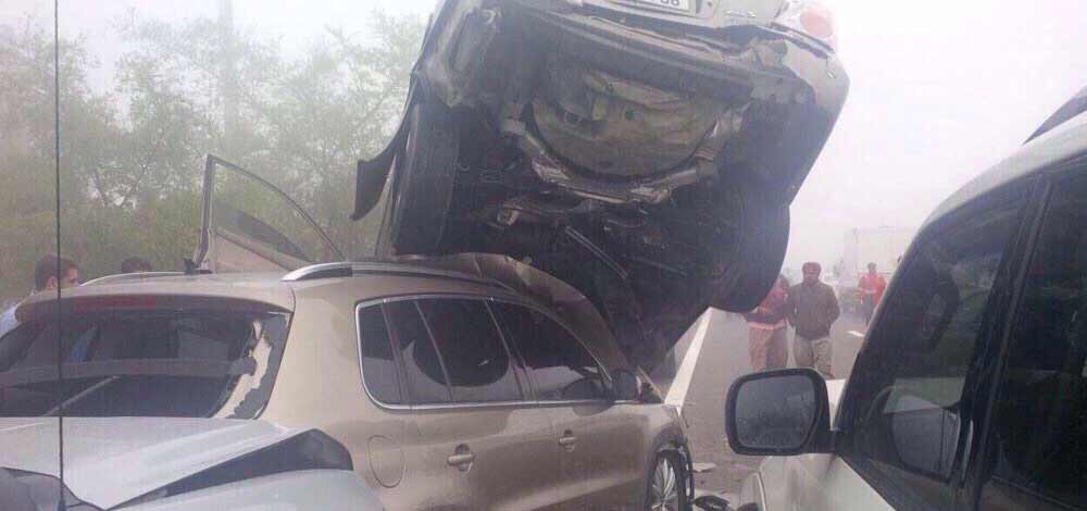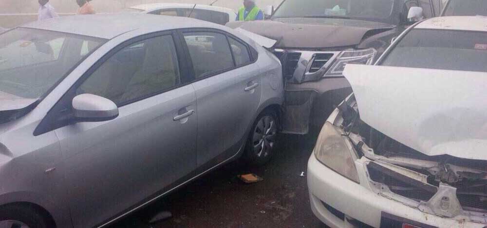 بالصور..تصادم عدد من السيارات على طريق أبوظبي-دبي نتيجة للضباب