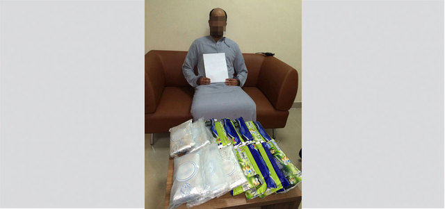المتهم وأمامه الحشيش مغلفاً بأكياس بلاستيكية. من المصدر