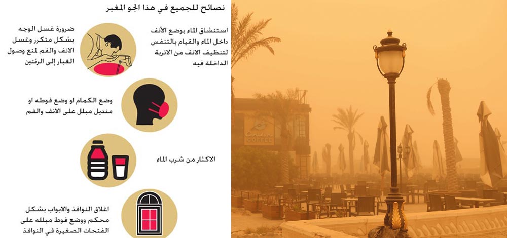 ونصح السائقين بعدم محاولة استخدام المياه في تنظيف الزجاج الأمامي خلال العاصفة الرملية، لأن الماء مع الغبار يؤدي إلى تراكم مادة طينية لزجة تضاعف من صعوبة الرؤية.