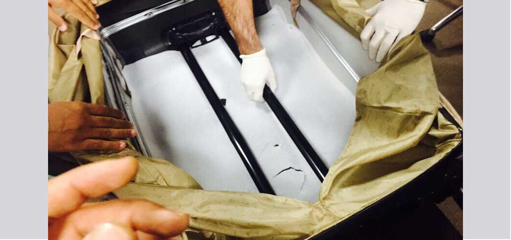 صاحبها، لافتاً إلى أن فريق المفتشين توجه لمعاينة الحقيبة، وبتمريرها على جهاز كشف الأشعة تبين وجود كثافة غريبة في القاع، فاستخدم موظفو الجمارك مركبة طوروها بأنفسهم في فحص المادة التي