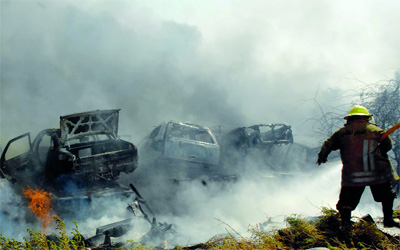 وتلقت غرفة العمليات في الدفاع المدني بلاغاً باندلاع الحريق، وتحركت فرقة إطفاء الى موقع الحادث، وتبين أن النيران أتت على حافلتين وسيارة «بيك أب» بالكامل.