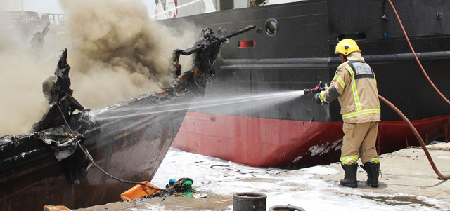 فرق الإطفاء تمكنت من محاصرة النيران قبل امتدادها إلى السفن المجاورة. من المصدر