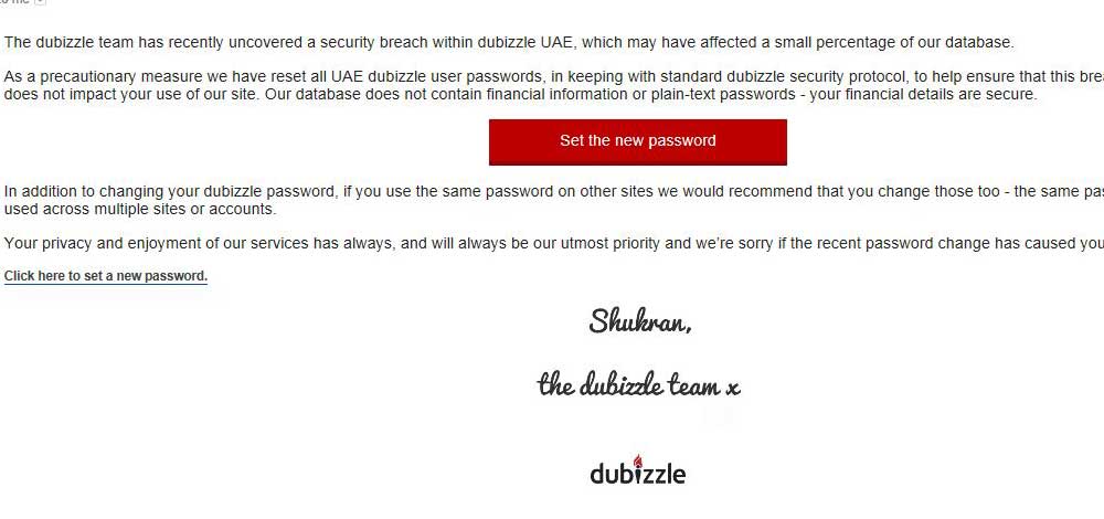وتفصيلاً، قالت ادارة موقع "دوبيزل" - dubizzle - في بيان صحافي إن الفريق التقني للموقع الإلكتروني المتخصص في الإعلانات المبوبة المجانية للمستخدمين في الشرق الأوسط وشمال أفريقيا، اكتشف،أخيراً، تجاوزاً أمنياً يمكن أن يكون قد طال نسبة ضئيلة من قاعدة بيانات الموقع.