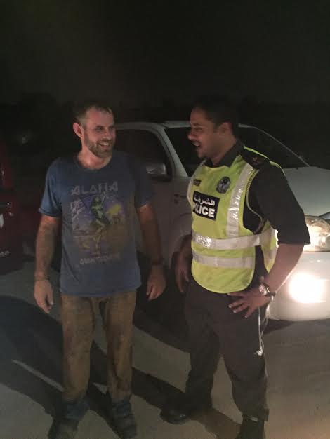 على الجانب البري للإمارة، وعلى الفور تم التواصل معه وتحديد موقعه الجغرافي عبر الهاتف الذكي، و تمّ تكوين فريق عمل عالي الكفاءة يضم مجموعة من سيارات الدوريات والإسعاف والإنقاذ، للتوجه فوراً إلى مكان البلاغ،
