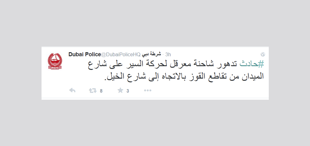 ونشرت شرطة عبر حسابها الخاص في موقع التواصل الإجتماعي "تويتر" تغريدة توضح فيها أن الحادث وقع صباح اليوم، مسبباً في عرقلة حركة السير والمرور.