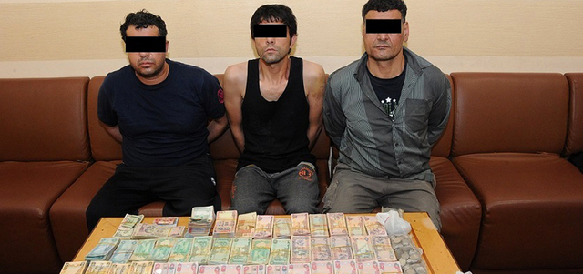 المتهمون وأمامهم الأموال التي استهدفوا سرقتها. من المصدر