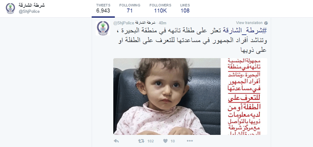 وناشدت الشرطة على حسابها الرسمي في تويتر أفراد الجمهور مساعدتها في التعرف على الطفلة أو من لديه معلومات عن ذويها بالتواصل مع مركز شرطة البحيرة الشامل على الارقام التالية : 065194111 & 065194100