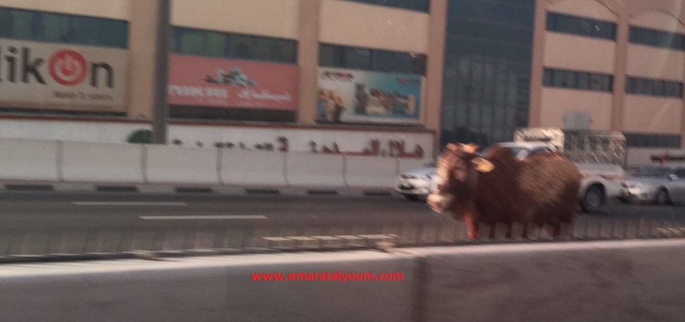 بالصور.. بقرة تتسبب بعرقلة حركة المرور ساعتين في الشارقة