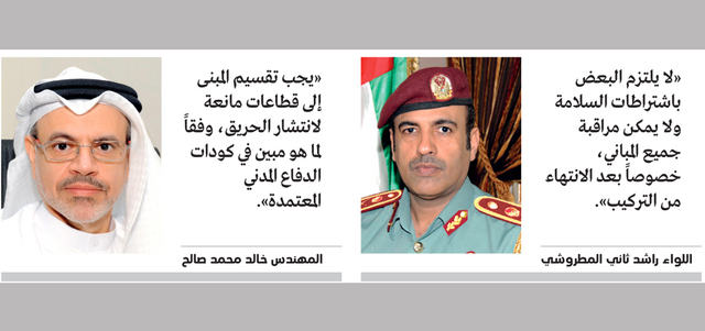 وأضاف: «يجب أيضاً أن تكون مانعة الاشتعال للجدران وأنظمة تكسية الواجهات حسب المعايير المحددة في الكودات، وألا تقل بأي حال عن ثلاث ساعات للمباني، وساعتين للفلل الخاصة، وأن تكون معدلات امتداد اللهب أقل من 25، ومعدلات إنتاج الدخان أقل من 450، حسب معيار انتشار اللهب وتطور الدخان، وذلك لمواد التكسية الداخلية والطلاء والتكسية الخارجية وفقاً للمعايير المعتمدة في كودات الدفاع المدني».