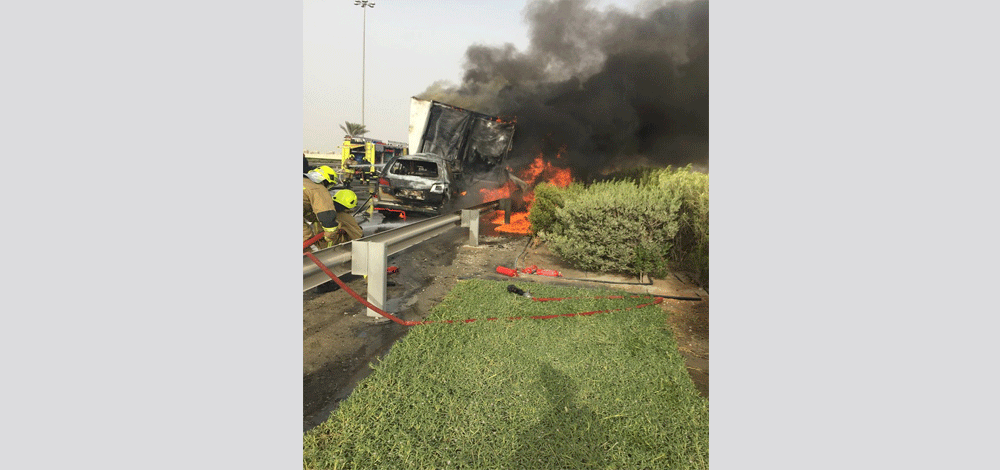 أدى حادث تصادم من الخلف بين شاحنة ومركبة من نوع "لكزس ستشين" إلى وفاة صاحبتها الإماراتية، على طريق "ياس" باتجاه دبي مقابل محطة الوقود عند الساعة الخامسة من بعد ظهر اليوم الاثنين، مما تسبب في حدوث حريق ووفاة سائقة المركبة، وانتقلت دوريات المرور والاسعاف إلى مكان الحادث لأجراء اللازم في الموقع، حيث باشر المحققون أعمالهم، وقامت دوريات المرور في موقع الحادث بفتح مسارات للسير من جانب محطة الوقود لتأمين حركة المرور وتم تحميل السيارتين المتضررتين ونقل السيدة المتوفاة نتيجة الاصطدام الى الطب الوقائي، وقامت دوريات المرور بالإشراف على تأمين انسيابية الحركة المرورية في المنطقة حتى تنظيف الموقع وإزالة المخلفات.