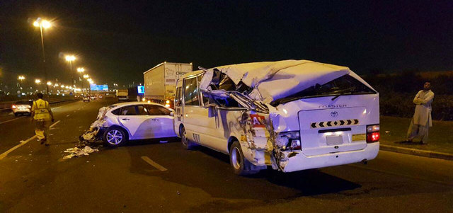 وتفصيلاً، قال المزروعي، إن الحادث الأول وقع في الساعة السابعة والنصف صباح السبت الماضي، حين وقع تصادم بين ثلاث مركبات على شارع الشيخ زايد في الاتجاه القادم من نفق المركز التجاري إلى نفق الكرامة، لافتاً إلى أن مركبة من طراز «كيا» يقودها شخص صربي الجنسية، انحرفت فجأة أمام مركبة من طراز «برادو» فاصدمت المركبتان، وبعد توقفهما بنحو ثلاث دقائق، قدمت حافلة خفيفة، وصدمت المركبة الثانية الـ(برادو) من الخلف، ما أدى إلى إصابة 14 شخصاً، أحدهم إصابته بليغة، وثلاثة متوسطة، و10 إصابات بسيطة، ونقلوا إلى المستشفى لتلقي العلاج.