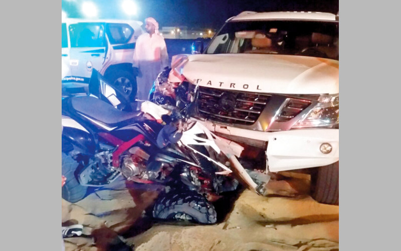 أصيب شاب 18 عاماً وفتاة 16 عاماً بإصابات بليغة في حادث تصادم بين دراجة ترفيهية كان يقودها الشاب برفقة الفتاة في منطقة رملية، ومركبة رباعية الدفع. وقال مدير الإدارة العامة للمرور العميد سيف مهير المزروعي، إن الحادث وقع مساء أول من أمس، بموازاة شارع الطي في منطقة الخوانيج، لافتاً إلى أن الحادث وقع نتيجة الاستعراض وتم نقل المصابين إلى المستشفى لتلقي العلاج اللازم.