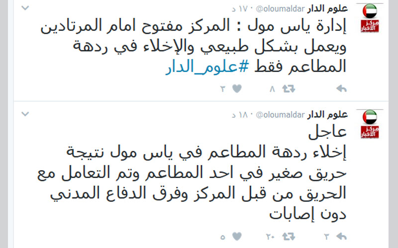 وذكرت إدارة ياس مول أن المركز مفتوح امام المرتادين ويعمل بشكل طبيعي والإخلاء في ردهة المطاعم فقط وذلك وفقا لما ورد عن الحساب الرسمي لـ علوم الدار على موقع تويتر.