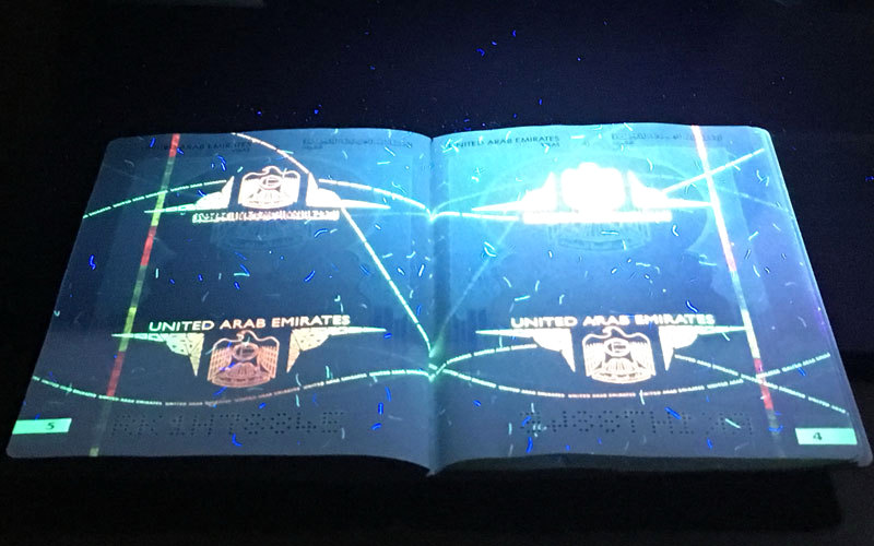 الأحبار والألياف الفسفورية في جواز السفر الإماراتي. من المصدر