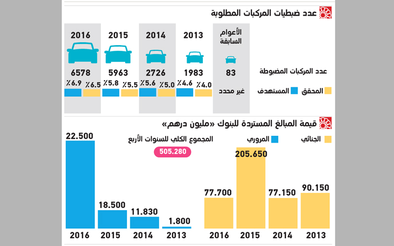 ولفت إلى أن الهدف الذي وضع للنظام خلال العام الماضي كان ضبط 6.5% من السيارات المطلوبة، وتحقق فعلياً بوساطة النظام 6.9%، بواقع 6578 مركبة، شملت 5164 سيارة مطلوبة مرورياً، و1414 مطلوبة جنائياً، بعضها تورط في حوادث، ومعظمها كان مطلوباً لعدم سداد أقساط بنوك.