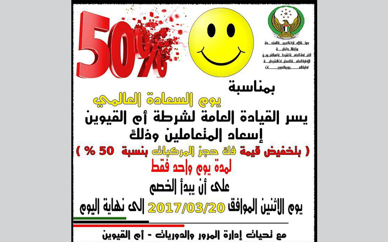 أعلنت شرطة أم القيوين أنها ستقوم يوم الاثنين الموافق 20-03-2017 بتخفيض قيمة فك حجز المركبات بنسبة 50% ولغاية نهاية اليوم ، وذلك بمناسبة #يوم_السعادة_العالمي.