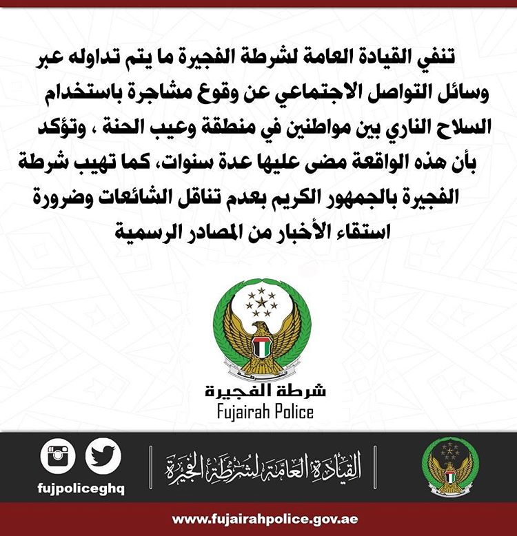 نفت القيادة العامة لشرطة الفجيرة ما يتم تداوله عبر وسائل التواصل الاجتماعي عن وقوع مشاجرة باستخدام السلاح الناري بين مواطنين في منطقة وعيب الحنة واكدت الشرطة على حسابها على "انستغرام" بأن هذه الواقعة مضى عليها عدة سنوات، كما دعت الشرطة الجمهور بعدم تناقل الشائعات وضرورة استقاء الأخبار من المصادر الرسمية.