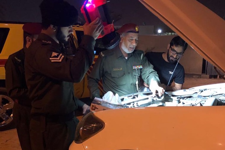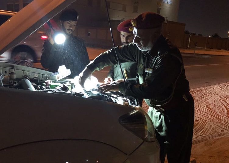 وكانت الدورية في طريقها لأداء مهمة تفتيشية عندما شاهدت السيارة متعطلة والشاب يحاول جاهداً إصلاحها فتدخلت على الفور لمساعدتهم وتقديم الدعم المطلوب وذلك في إطار الدور المهم الذي تقوم وحدات الإطفاء.