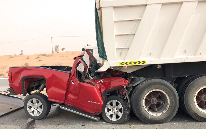 توفي شاب مواطن، يبلغ من العمر 28 عاماً، في حادث تصادم بين مركبة وشاحنة على طريق الذيد - الشارقة، نتيجة انحشار المركبة التي كان يقودها تحت شاحنة، مساء أول من أمس.