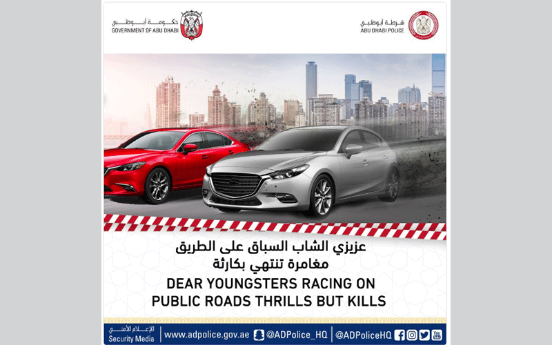 حذرت شرطة أبوظبي الشباب من المشاركة في سباقات خطرة وقيادة المركبات بطيش وتهور على الطرق وشددت على أنه لن يكون هناك أي تهاون في تطبيق القانون على "المتهورين" الذين يعرّضون حياتهم وحياة الآخرين للخطر بإيقافهم وحجز مركباتهم وتحويلهم إلى القضاء لاتخاذ الإجراءات القانونية بحقهم.