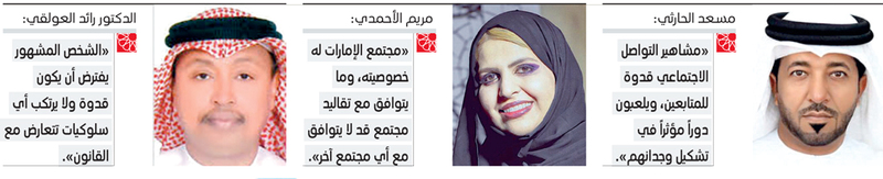 من جانبها، أكدت الناشطة المجتمعية مريم الأحمدي، أن لمجتمع الإمارات خصوصيته التي يتميز بها عن بقية المجتمعات الأخرى، وبالتالي ما يصلح لمجتمع ويتوافق مع تقاليده ومبادئه الإنسانية قد لا يتوافق بالضرورة مع أي مجتمع آخر، ولهذا كان من الضروري على مشاهير التواصل الاجتماعي أن يكون لديهم بعض من التفرقة بين ما يلائم مجتمع الإمارات وما يتنافى مع قيمه وتقاليده الراسخة.