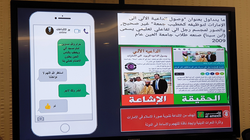 ولفت إلى أن من الشائعات التي استهدفت الدولة كذلك، شائعة «الإمام الآلي في مسجد الشيخ زايد»، وعلق عليها أحد عناصر ما يعرف بالذباب الإلكتروني على شبكات التواصل، قائلاً: «الآن يخلون الأصنام تصلي فينا»، وبتتبع الفيديو الذي رافق هذه الشائعة تأكد أنه مجسم لشخصية «ابن سينا» صممه طلبة من جامعة العين عام 2009، فيما أن البعد الأمني وراء هذه الكذبة هو إثارة النعرات الدينية والطائفية وإيجاد سبب للتهجم على الدولة، وتشويه صورة الإسلام في الإمارات، مشيراً إلى أن البعض يصدق للأسف في ظل توثيق الشائعة بفيديو أو صور مصنوعة ومعالجة فنياً من قبل الجهات أو الدول التي تقف وراء ذلك. وشرح أن الشائعات تطورت مع مرور الوقت وصارت تعتمد على وسائل أكثر تأثيراً، إذ بدأت أولاً بطريقة المشافهة والكتابة، ثم مرحلة التحرير المحترف الذي يقف خلفه أصحاب أهداف سياسية أو أمنية أو اقتصادية، ثم قوالب معرفية ومعلوماتية مثل طرحها في صورة نتائج دراسات أو استطلاعات بهدف إعطائها قدراً من الصدقية، فتجدها تبدأ بعبارة «دراسة حديثة» ما يلفت انتباه المتلقي ويعزز ثقته بها.