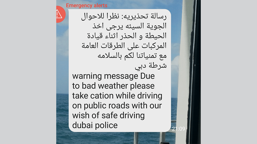 تلقى مواطنون ومقيمون في أبوظبي ودبي، رسالة تحذيرية على هواتفهم المحمولة من الشرطة، تنبهم إلى اضطراب الأحوال الجوية، وتدعوهم لأخذ الحيطة والحذر اثناء القيادة.