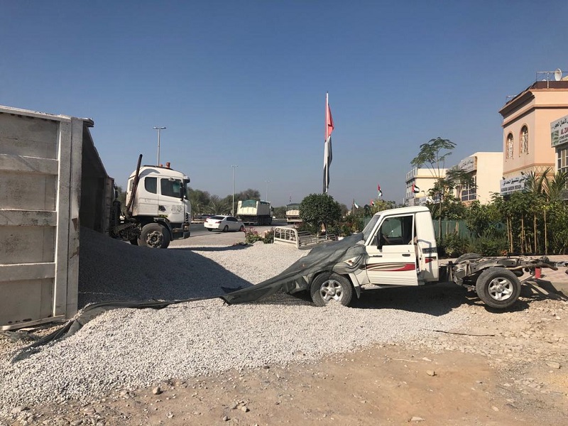 وأضاف أن سائق الشاحنة الثانية حاول تفادي الاصطدام بالمركبة إلا أن شاحنته انحرفت عن مسارها وتدهورت على الطريق، ما أدى إلى سقوط كميات كبيرة من مادة الكنكري المحملة في الشاحنة على مركبة والده من جهة الخلف، وغرق المركبة بالكامل بالمادة الصلبة.