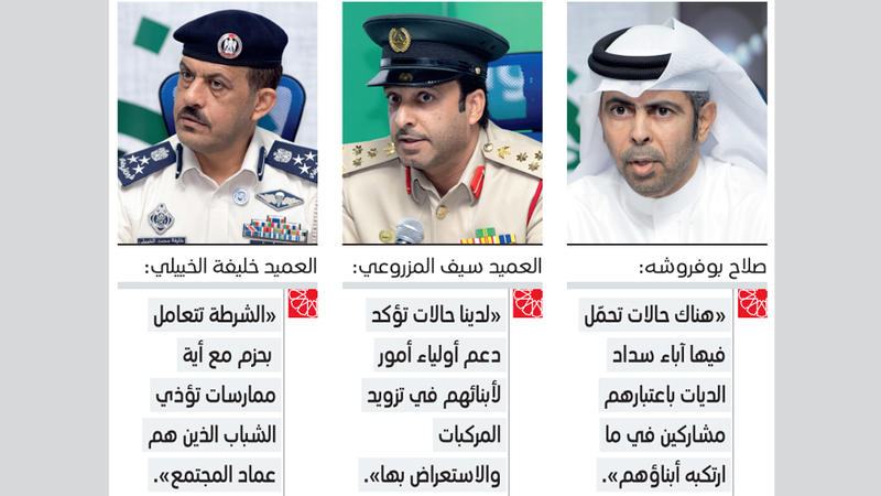 من جهته، قال مدير الإدارة العامة للمرور العميد سيف مهير المزروعي: «لدينا عشرات الحالات التي تؤكد دعم أولياء أمور لأبنائهم في تزويد المركبات والاستعراض بها، بل إن البعض يتصدى لعمليات الضبط، وفي حال تم حجز المركبة أو اتخاذ موقف ضد الأبناء يأتي الأب للتوسط لابنه أو يشكو الإجراءات القانونية، غير مدرك أن تصرفه هذا لا يقل فداحة عما قام به الابن ذاته، ولا يرتدع إلا بعد حدوث مأساة.