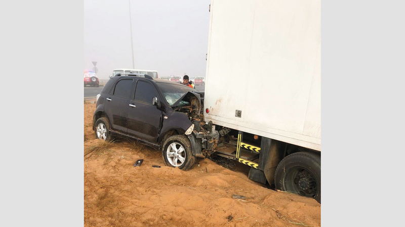 المركبة صدمت الشاحنة من الخلف نتيجة تدني الرؤية. من المصدر